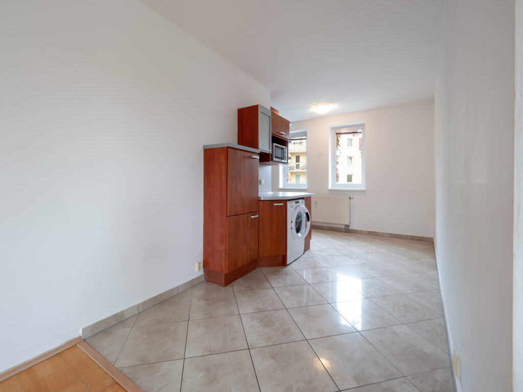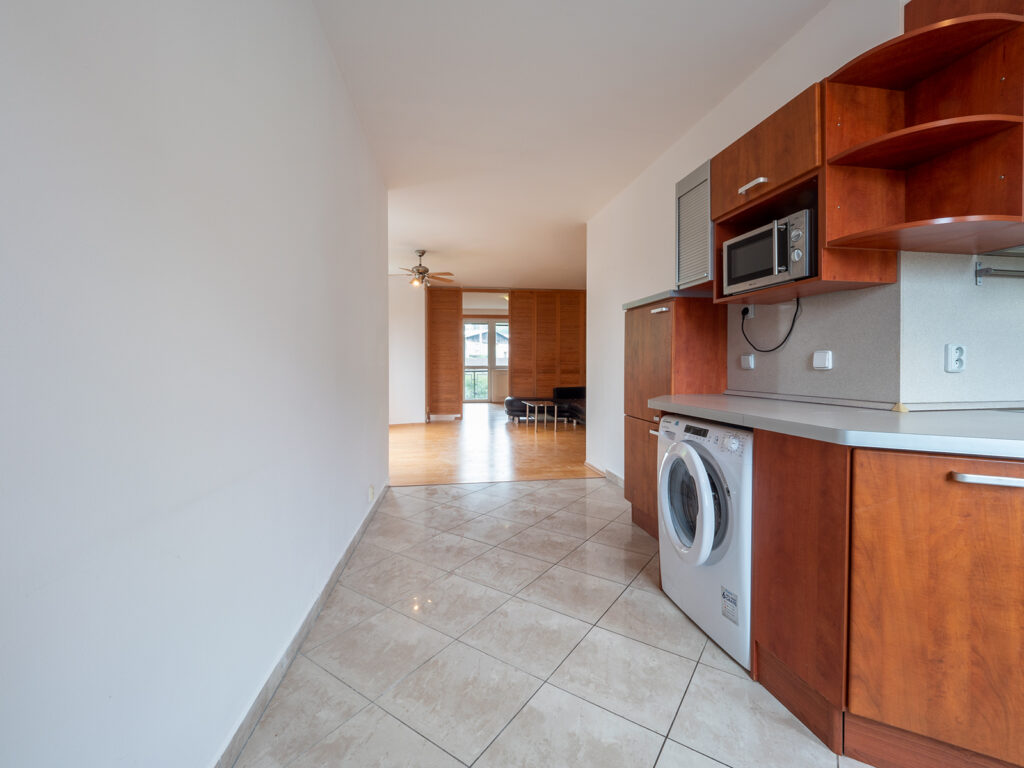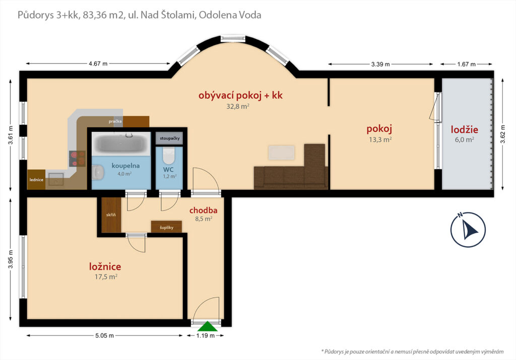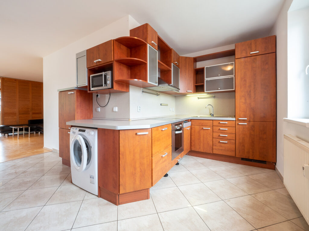 Podnájem nezařízeného bytu s dispozicí 3+kk o celkové výměře 77 m² + lodžie 6 m², který je ve 2. NP revitalizovaného bytového domu v ul. Nad Štolami, Odolena Voda. Byt sestává z obývacího pokoje s kuchyňským koutem (32,8 m²), kuchyň je vybavena pračkou, lednicí, varnou deskou, sporákem, mikrovlnou troubou, myčkou a digestoří. Dále je v bytě ložnice (17,5 m²), pokoj, který je od obývacího pokoje oddělen dřevěnou zástěnou (13,3 m²) ze kterého je vstup na lodžii (6 m²). Dále je v bytě chodba s vestavěnou skříní (8,5 m²), koupelna s vanou (4 m²) a separátní WC (1,2 m²) V blízkosti bytu se nachází veškerá občanská vybavenost (supermarket, večerky, restaurace, kavárna, pošta, zdravotní středisko, škola, školka, bankomat). Autobusová zastávka příměstské dopravy je 3 minut chůze. Dostupnost do Prahy na metro v Kobylisích autobusem 25 minut nebo 15 minut autem.